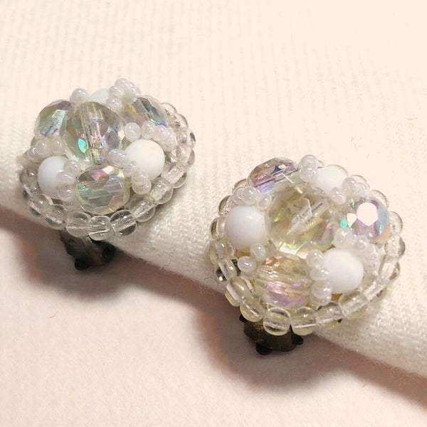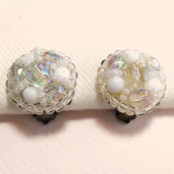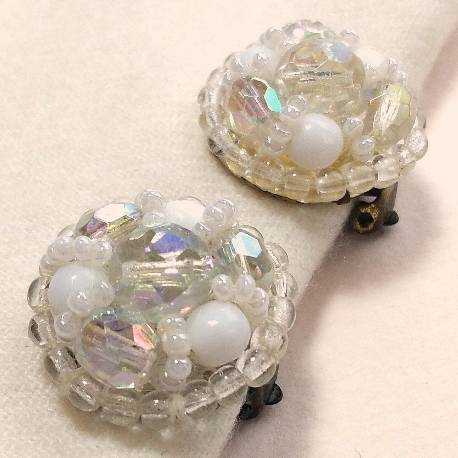 Vintage oorclips met in ronde compositie geregen witte en heldere ab kraaltjes uit de jaren '50-'60.