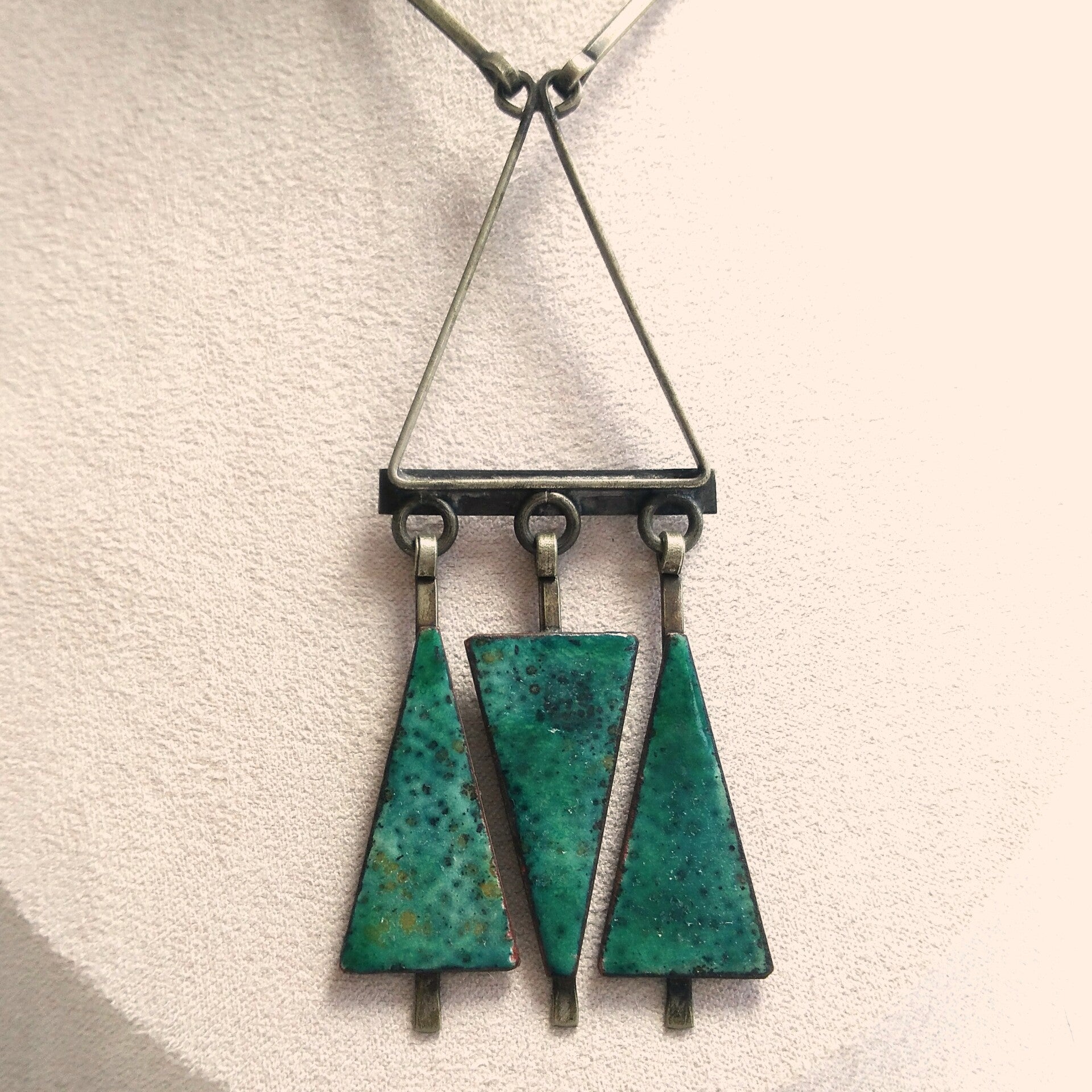 Vintage ketting van zilverkleurig metaal met petrolgroen geëmailleerde elementen in Modernistische stijl uit de jaren '70.