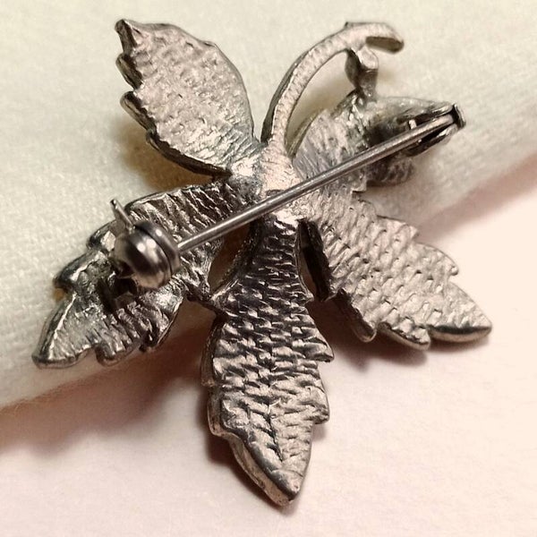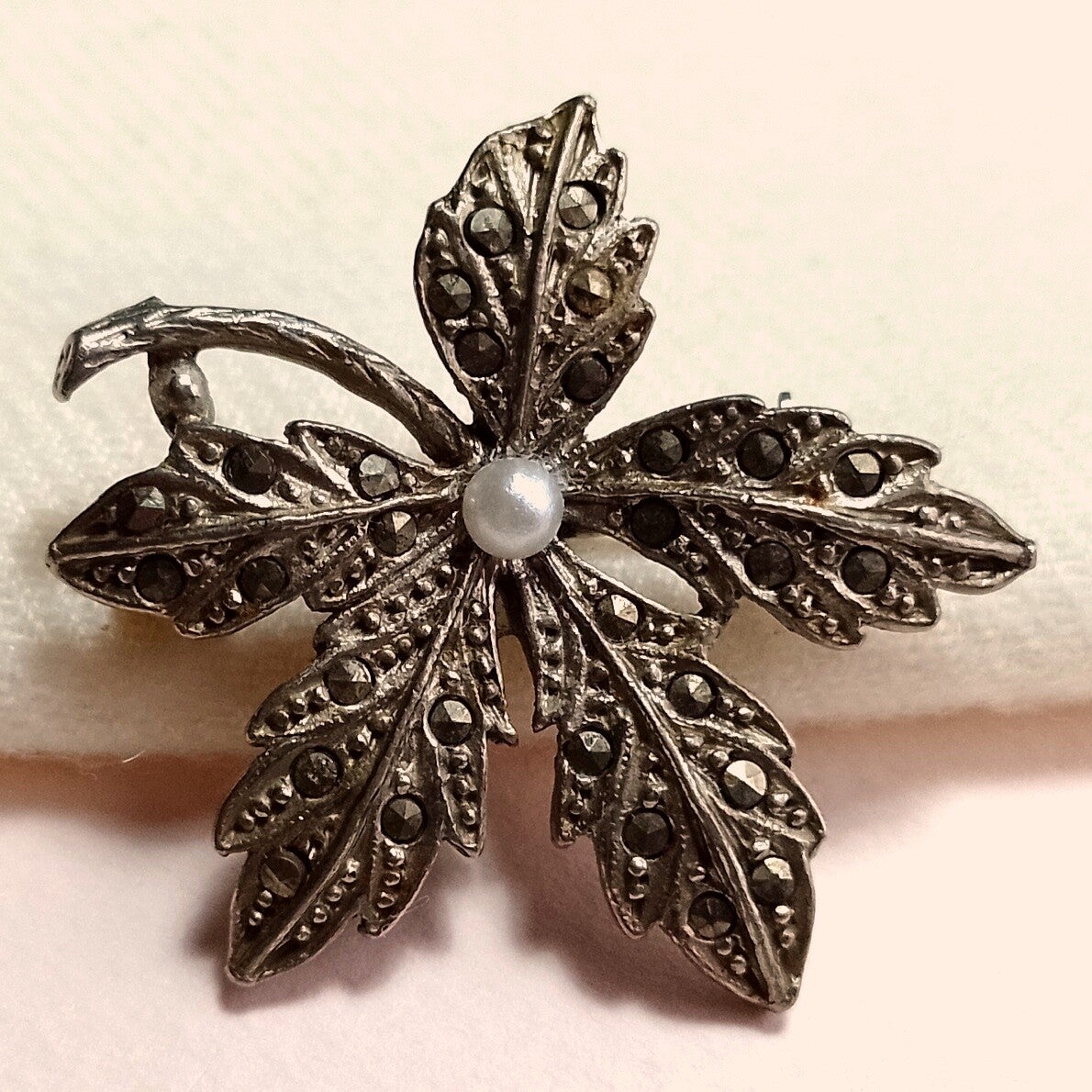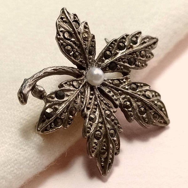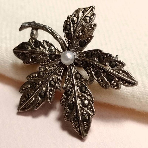 Vintage broche van zilverkleurig metaal bezet met markasiet en faux parel in bladvorm uit de jaren '50-'70.